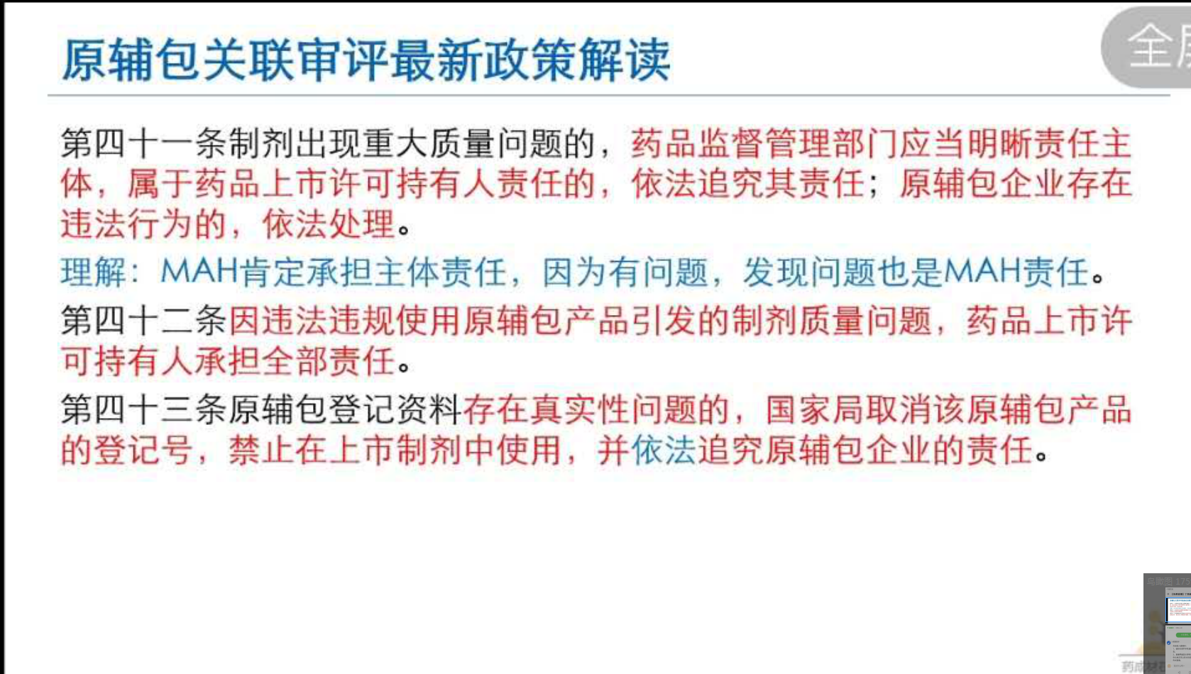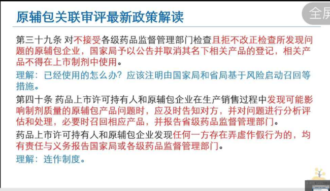 解讀:第四十一條和四十二條,上市持有人是責(zé)任主體,所以原輔包有問題和發(fā)現(xiàn)有沒有問題都是你MAH的事,你自己選的你對所選的產(chǎn)品的質(zhì)量負責(zé)。MAH對其違法違規(guī)使用原輔包引發(fā)的制劑質(zhì)量問題負全部責(zé)任,因此持有人對原輔包的質(zhì)量要求將會逐步提高,